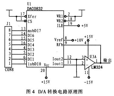 为实现电压值的D/A模转换,在电路中还要专门设计D/A转换电路,如图4所示。为降低设计成本,采用8位DAC0832转换器。DAC0832属于倒T 型电阻网络型D/A转换器,内部无运算放大器,输出为电流形式,因此,使用时,需外接一个运算放大器。DAC0832可根据实际情况接成双缓冲、单缓冲和直缓冲3种形式,此D/A转换器接成第3种形式使用,即引脚1、2、17、18接低电平,19引脚接+5 V。引脚8为参考电压输入端口,接+10 V电源,当数字输入端全为高电平时,模拟输出端为-1O V。