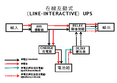 其原理与后备式不断电系统相去不远,其主要不同在于此类产品将充电回路与变流器整合为双向转换回路,可自动侦测输入电压是否符合于正常范围内,如有偏差可由稳压电路升压或降压,提供较稳定之输出电压,其它工作原理与后备式相同。可参阅在线互动式不断电系统方块图。