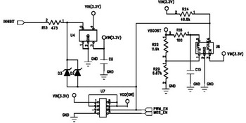PTH03030模块的升压电压为6.5V,实际测试最高可以达到28V的升压输出,升压后的电源提供整个模块的MOSFET驱动IC U1,电压跟踪比较运放的供电。