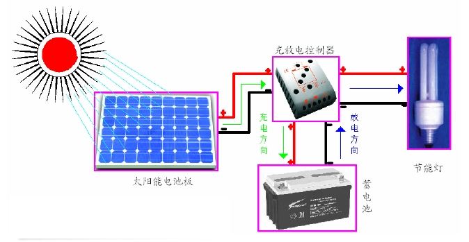 系统工作原理简单,利用光生伏特效应原理制成的太阳能电池白天太阳能电池板接收太阳辐射能并转化为电能输出,经过充放电控制器储存在蓄电池中,夜晚当照度逐渐降低至10lux左右、太阳能电池板开路电压4.5V左右,充放电控制器侦测到这一电压值后动作,蓄电池对灯头放电。蓄电池放电8.5小时后,充放电控制器动作,蓄电池放电结束。充放电控制器的主要作用是保护蓄电池。