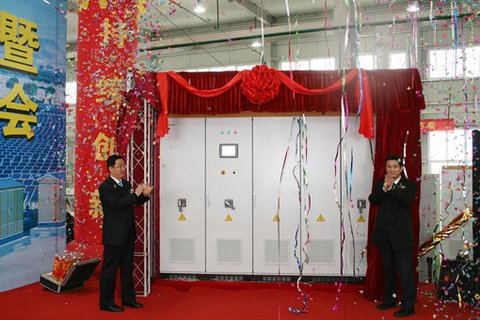 并网仪式前,徐根应厅长、杨增权副市长还共同为阳光电源最新研发成功的高压并网光伏逆变器举行了隆重的产品下线仪式。高压并网光伏逆变器是阳光电源专为兆瓦级光伏电站量身定做的一体化解决方案。系统将两台高效逆变器、一台中压变压器(定制)、交直流配电、监控通讯等设备集成于单个移动房内,从而增强了系统的安全性与可靠性,方便了系统的运输和安装,提高了系统的效率和发电量,是最佳的兆瓦级光伏电站解决方案。