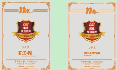 2010年10月26日,第11届中国IT渠道论坛颁奖晚宴在京隆重举行,揭晓了2010年度渠道首选品牌奖、渠道畅销品牌奖、最佳满意品牌奖和最佳成长品牌奖等奖项的评选结果。全球领先的UPS制造商伊顿公司不负众望,在激烈的角逐中一举斩获两项大奖——伊顿品牌荣获 “渠道首选品牌奖”,山特品牌荣获“渠道畅销品牌奖”。