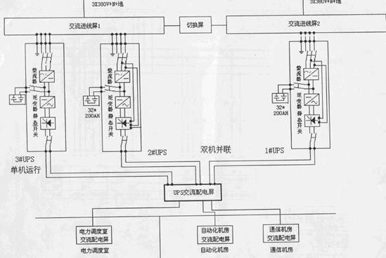 如图一所示:该供电局配置两路市电,分别由交流进线屏1和交流进线屏2向UPS供电,两个交流进线屏间由一个手动切换屏,可以进行切换。1#UPS和2#UPS为M品牌的15KVA 1+1并机系统,3#UPS为A品牌UPS,设计容量为15KVA。交流进线屏1向3#UPS和2#UPS供电,交流进线屏向1#UPS供电。