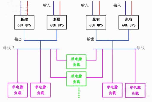 由于原系统为早期规划建设,所有用电负载输入端的电源均采用2台60KVA UPS并联输出电源。要求新增加UPS系统与原有系统构成双母线优化方案,为原有的设备及新增设备提供安全可靠的电源保护。