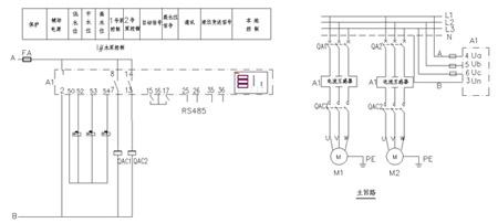 智能水泵控制器,集成了水泵控制需要的电气元件,包括电压电流显示、多功能保护继电器、手/自动转换开关、启/停按钮、水位和水泵状态指示等于一体,面柜式安装。在给/排水自动模式下,两泵交替互备,根据水位不同情况,控制方式支持中水位一台水泵运行,高(低)水位两台水泵同时运行。电流保护支持独立开/关设置,支持备用泵只报警不脱扣,满足地下车库、消防栓等消防场所应用。智能型水泵控制器的二次接线图如图3所示。相比于传统方式,其具有接线简单,功能强大,后期升级方便等优点。