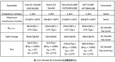 目前市面上常见的SiC Mosfet电流均不大于50A,以常见的1200V/20A为例,列举了Cree公司与Rohm公司的SiC Mosfet管的部分电气参数;同样例举了Fairchild 与APT公司的1200V/20A Si IGBT系列的电气参数进行比较;