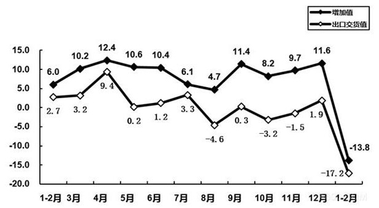 图1 2020年1-2月以来电子信息制造业增加值和出口交货值分月增速(%)