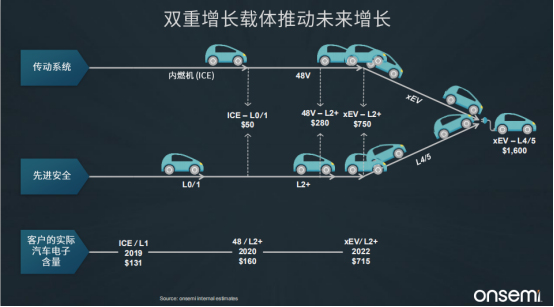 据安森美提供的数据显示,客户实际使用的每辆汽车电子含量,2019年CE/L1价格131美元,2020年48/L2+价格160美,2022年xEV/L2+价格增长到715美元,短短3年间增加到了5倍。