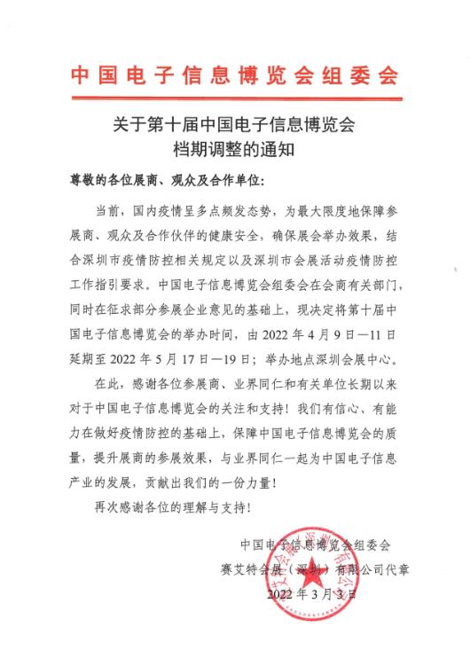 当前,国内疫情呈多点频发态势,为最大限度地保障参展商、观众及合作伙伴的健康安全,确保展会举办效果,结合深圳市疫情防控相关规定以及深圳市会展活动疫情防控工作指引要求,中国电子信息博览会组委会在会商有关部门,同时在征求部分参展企业意见的基础上,现决定将第十届中国电子信息博览会的举办时间,由2022年4月9日—11日延期至2022年5月17日—19日,举办地点深圳会展中心。