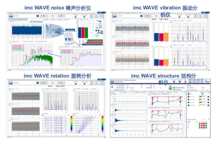 所有imc WAVE 2022分析仪都支持对噪声或振动的原因、传播路径和影响进行整体分析。除声音和振动信号外,还包含其他物理参数的处理功能,例如速度、力、压力、温度,以及数字现场总线数据等。imc WAVE 2022软件可与任何imc测量数据采集系统无缝配合。四款分析仪亦可直接集成到imc STUDIO测量控制管理软件平台中,以便为自动测试台配备NVH功能。同时,联合同属Axiometrix Solutions旗下测量品牌GRAS Sound&Vibration的麦克风或半球阵列,我们可为全球客户提供完整的声压、声功率测量解决方案。