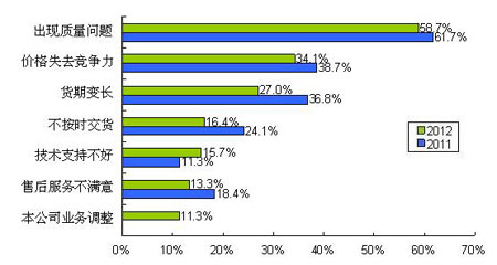 另外,机电元件的采购比例由2011调查的57.6%下降到2012调查的39.9%。机电元件的制造门槛相对较低,其供应体系中,国内厂商的比例很大,供应分散,整机制造商供应来源多元化更为明显。