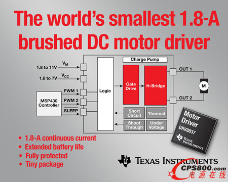 日前,德州仪器 (TI) 宣布推出业界最小型 1.8 A 有刷 DC 电机驱动器,进一步壮大其不断发展的低电压 DRV8x 电机驱动器产品阵营。该 DRV8837 与最接近的同类竞争产品相比外形缩小 75%,可实现更小巧、更时尚、更具创新性的系统设计。此外,与现有器件相比,它还将 RDS(ON) 降低 50%,将睡眠电流降低 75%,从而延长电池使用寿命,提高电池供电或低电压运动控制应用的散热性能。