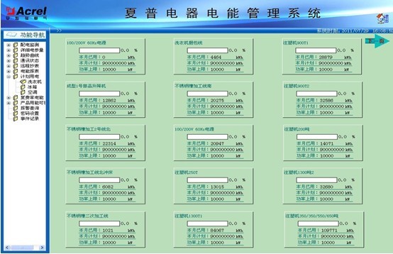 上海夏普电器现在分为两个厂区,新厂主要生产洗衣机和冰箱等电器,老厂主要生产空调设备。原先厂区的配电室内安装的电力仪表主要为指针式,且多为电流和电压表,工厂对于所生产产品的耗能情况只是在总量上有个统计,而对于每个回路设备的耗能情况没有做到详细的统计,这对于工厂下一步推进企业节能降耗工作带来了诸多不便。通过这次对上海夏普电器公司各配电室内老式电力仪表的更新改造,拆除原先指针式电流电压表,安装上海安科瑞电气股份有限公司的ACR120EFL多功能电力仪表,使得工厂能够对全厂的产品耗能情况做到更加精细化的预算和管理,为企业的推进节能降耗打下基础。