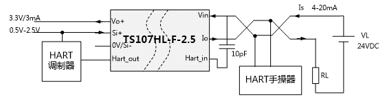 两条传输线节约了现场与控制室的布线成本;高集成的设计简化了客户端应用;PIN9的小体积减少了产品的占板面积,为客户带来更多的设计空间。支持HART协议的两线制回路供电信号调理模块TS107HL-F-2.5可以应用于各类智能仪表中。