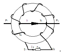 低压电流互感器的工作原理如图1所示,电流互感器的一次绕组串联在被测线路中,I1为线路电流即电流互感器的一次电流,N1为电流互感器的一次匝数,I2电流互感器二次电流(通常为5A、1A),N2为电流互感器的二次匝数,Z2e为二次回路设备及连接导线阻抗。当一次电流从电流互感器P1端流进,P2端出,在二次Z2e接通的情况下,由电磁感应原理,电流互感器二次绕组有电流I2从S1流过,经Z2e至S2,形成闭合回路。由此可得电流在理想状态下I1×N1=I2×N2,所以有I1/I2=N1/N2=K,K为电流互感器的变比。