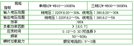 DJW-WB、SJW-WB单、三相系列微电脑无触点补偿工稳压器,它集先进的组合绕组被偿方式和无触点开关、微机控制交流稳压技术于一体,具有高效节能、调节快速、三相自动平衡、无机械故障和炭刷磨损,并具有延时、过、欠压报警和保护等功能。